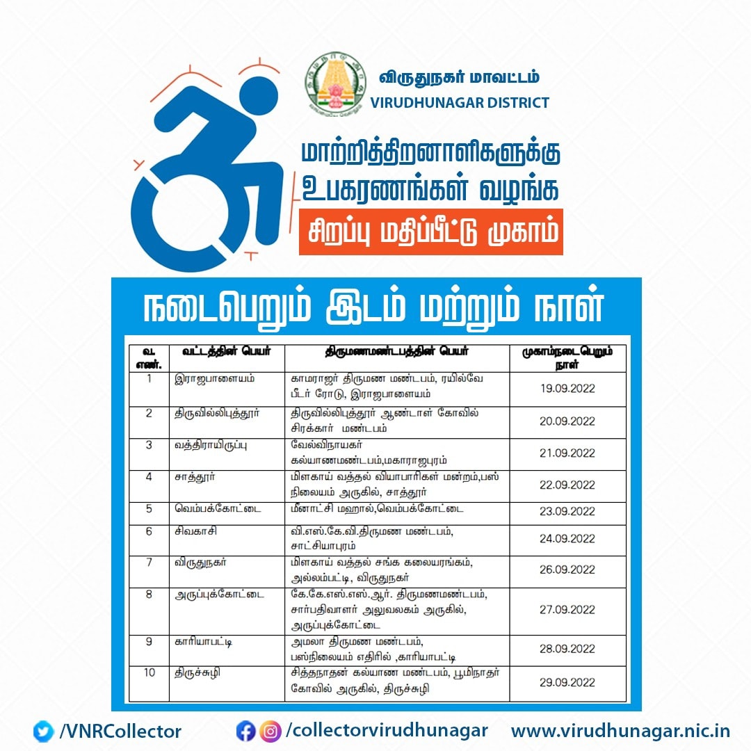 வெம்பக்கோட்டையில் 23.09.2022 அன்று மூத்த குடிமக்கள், மாற்றுத்திறனாளிகளுக்கு தேவையான செயற்கை உறுப்புக்கள், உபகரங்கள் வழங்குவதற்கான மதிப்பீடு முகாம் நடைபெற உள்ளது.